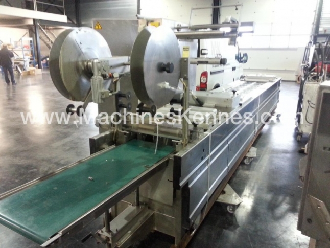 This used Multivac R530 Thermoformer is built in 1997. On the PLC in the machine is standing operating hours. The machine has a film width of mm and there is a dye set on the machine with an exit of mm. The format is now divided in a format. The machine is equipped with formats. These formats can be used for packaging. The format does not have a stamp. The frame of the machine is currently mm long, but we can always adjust this to the dimension you need.