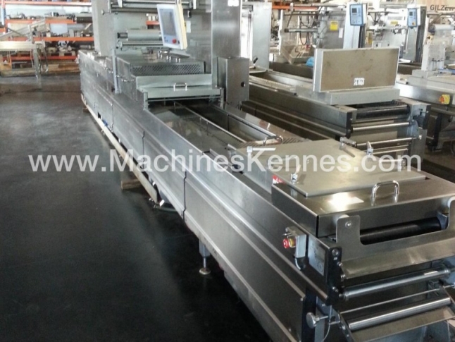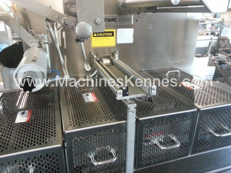 This used Multivac R550 Formschrink Thermoformer is built in 2007. On the PLC in the machine is standing 1156 operating hours. The machine has a film width of mm and there is a dye set on the machine with an exit of mm. The format is now divided in a format. The machine is equipped with formats. These formats can be used for packaging. The format does not have a stamp. The frame of the machine is currently mm long, but we can always adjust this to the dimension you need.