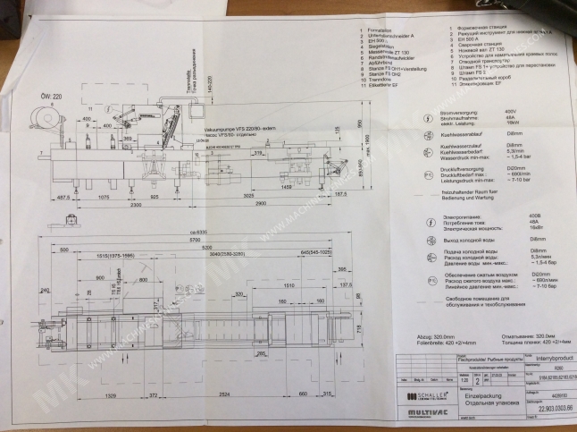 Deze gebruikte Multivac R260 Dieptrekmachine is van bouwjaar 2004. Op de PLC staan 1688 draaiuren. De machine heeft een foliebreedte van 420mm en er is een formaat geplaatst met een afslaglengte van 320mm. Het formaat is nu opgedeeld in een 2.1 indeling. De machine is voorzien van 3 formaten. Deze formaten kunnen voor Skin verpakkingen gebruikt worden. Het formaat beschikt niet over een stempel. Het frame van de machine is op dit moment 5700mm lang, maar kunnen wij altijd naar wens aanpassen.