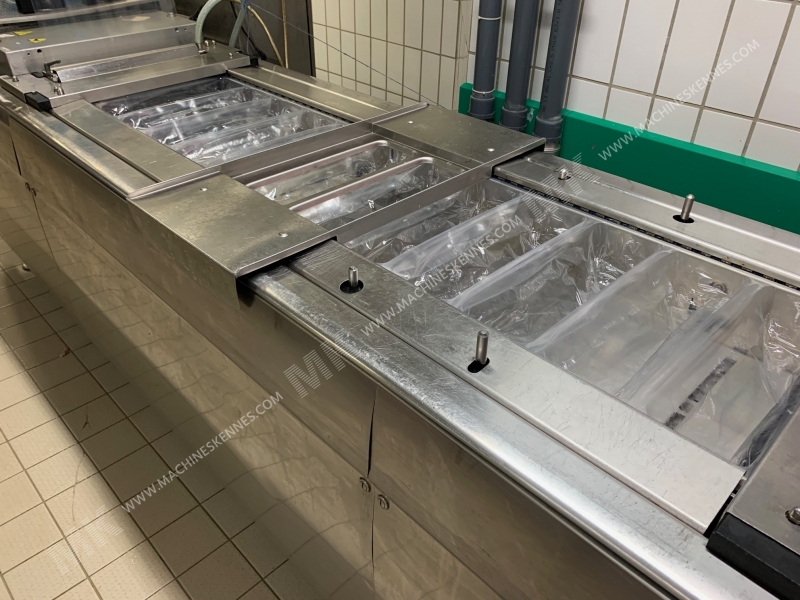 Dieser gebrauchte Multivac R145 Thermoformer Maschine ist in 2009 gebaut. Die Maschine hat eine Filmbreite von 420mm, auf der Maschine ist einem Ausgang von 280mm jetzt. Das Format wird jetzt in einem 1.2 Format geteilt. Die Maschine ist mit 1 Format ausgestattet. Dieses Format kann für Weich Foilverpackungen verwendet werden. Das Format hat keinen Stempel. Der Rahmen der Maschine ist jetzt 4500mm lang, aber wir können immer dieses an die Abmessung justieren, die Sie benötigen.