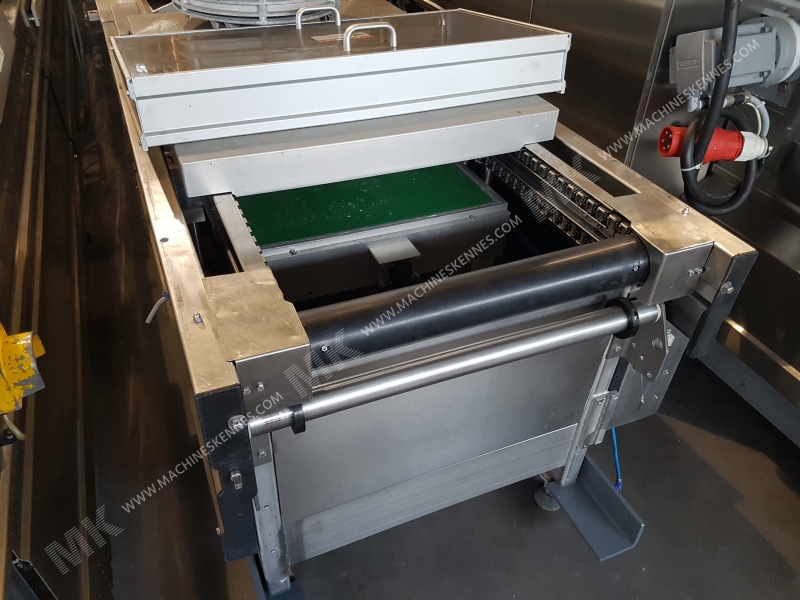 Deze gebruikte Multivac R530 Dieptrekmachine is van bouwjaar 2000. Op de PLC staan 20000 draaiuren. De machine heeft een foliebreedte van 580mm en er is een formaat geplaatst met een afslaglengte van 500mm. Het formaat is nu opgedeeld in een 3.2 indeling. De machine is voorzien van 1 formaat. Dit formaat kan voor Zacht- en hardfolie verpakkingen gebruikt worden. Het formaat beschikt niet over een stempel. Het frame van de machine is op dit moment 9000mm lang, maar kunnen wij altijd naar wens aanpassen.